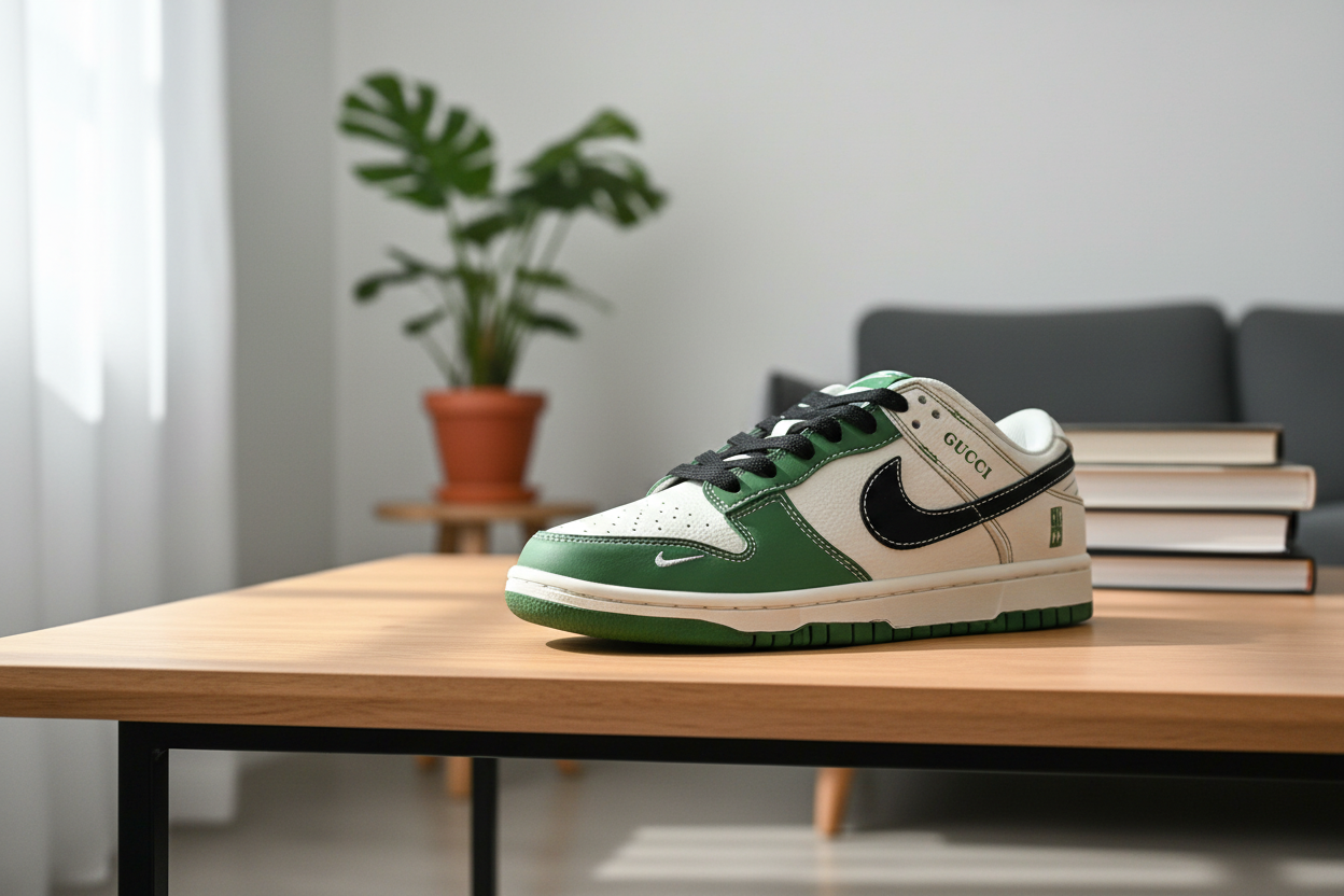 Gucci x Nike White Green Leather Sneakers, featuring iconic black Swoosh and Gucci logo, luxury unisex casual shoes for everyday wear, combining fashion and comfort in premium style.