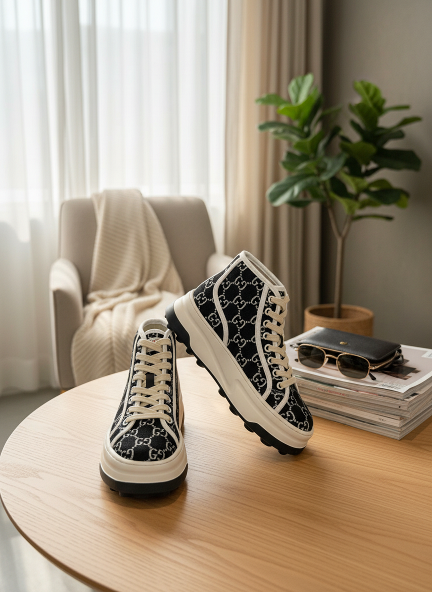 Gucci GG Supreme Black White High-Top Platform Sneakers, featuring signature GG print fabric, chunky sole for height, ankle coverage for warmth, vintage unisex design, perfect for luxury casual style.