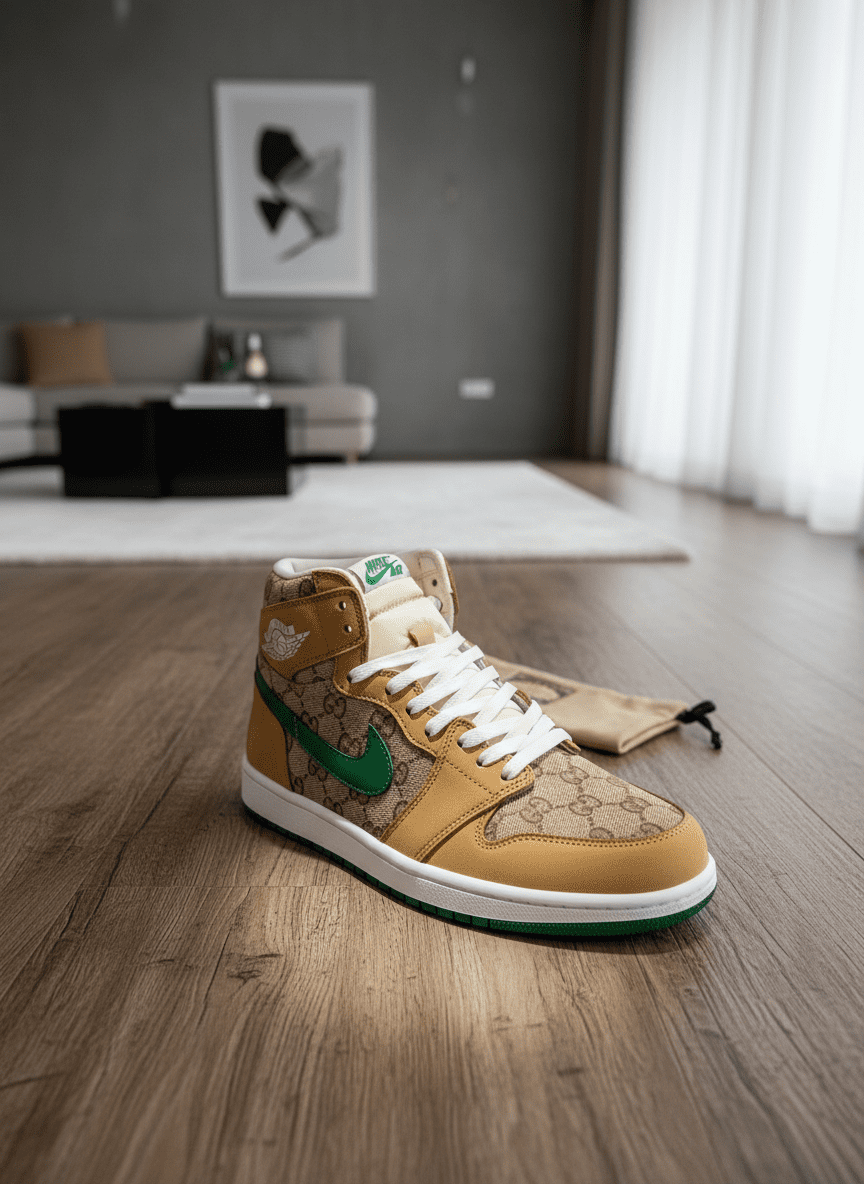 Gucci x Air Jordan High-Top Sneakers, khaki with green accents, GG canvas and suede, double G motif and wing logo, trendy unisex design for casual sports style, luxury and fashion flair.