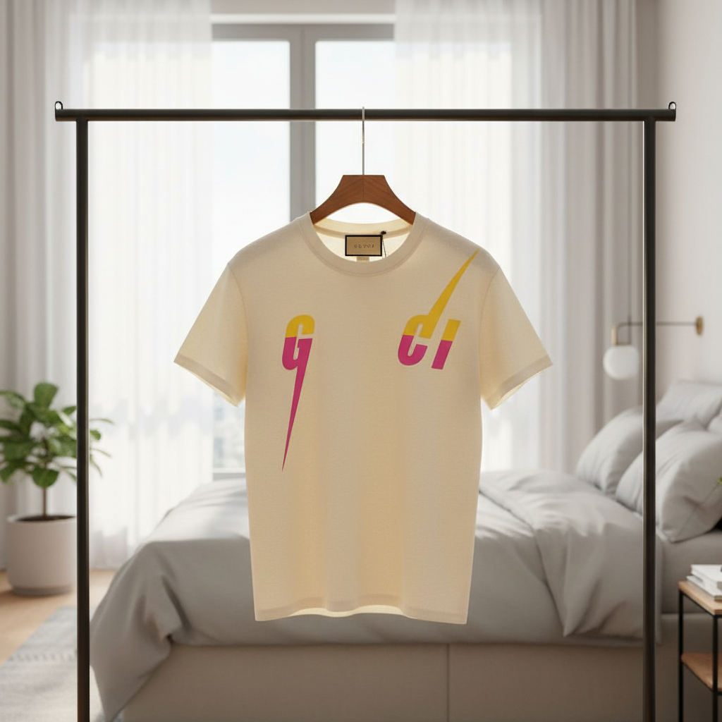 Gucci Off-White Cotton T-Shirt, soft and breathable, featuring yellow-pink contrast letter print with lightning motif. Unisex design for stylish everyday wear, showing unique brand identity.