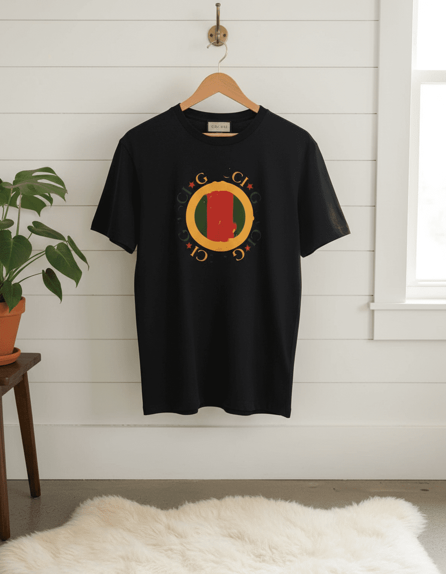 Gucci black cotton T-shirt featuring a circular totem print with iconic red-green stripes, surrounded by brand letters and stars. Soft, stylish, unisex design for luxury casual wear.