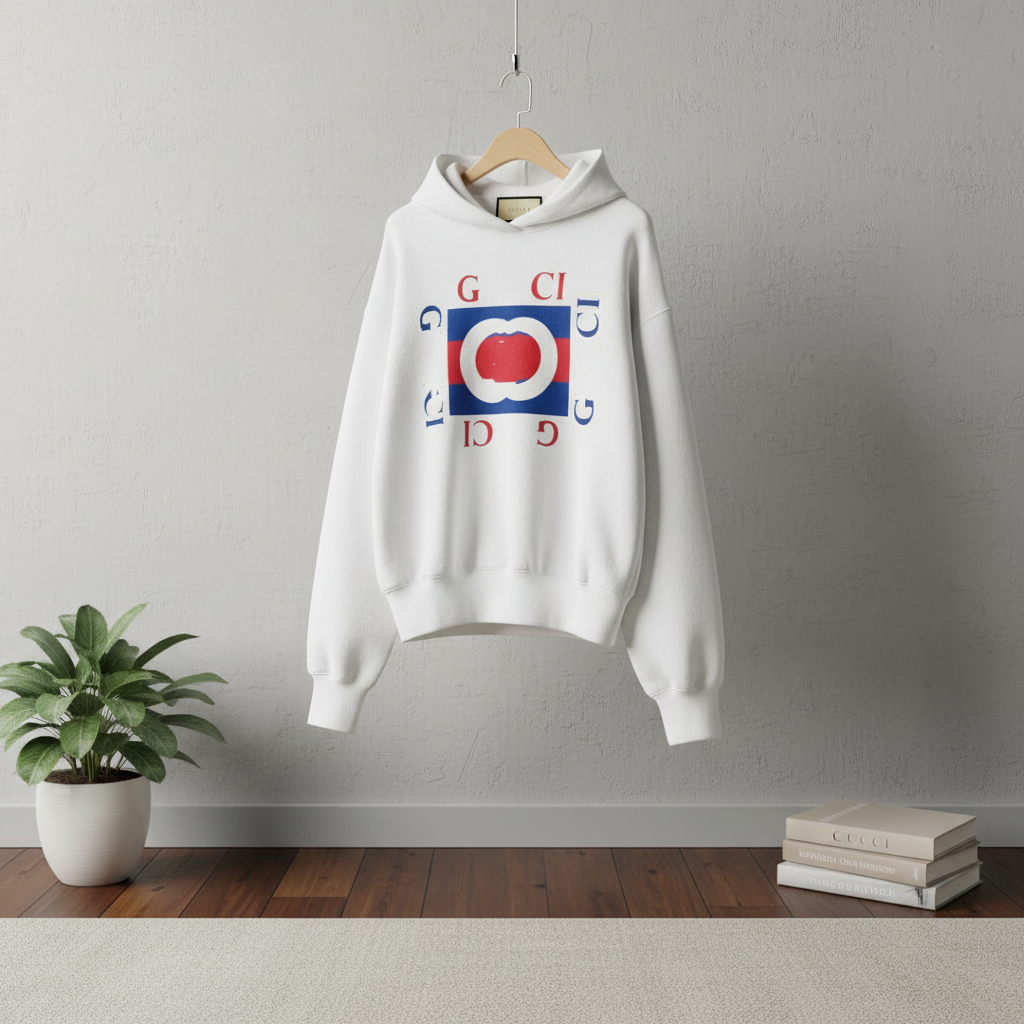 Gucci White Cotton Hoodie features premium fabric, adjustable drawstring hood, red-blue Double G print with surrounding logo, unisex design for luxury, comfort, and modern casual style.