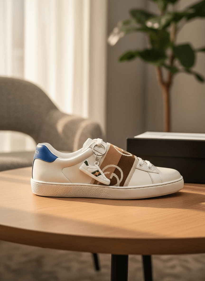 Gucci GG Series White Leather Sneakers feature premium leather, classic GG stripe design, blue tongue accent, side charm detail, unisex luxury style, versatile comfort, and iconic brand elegance.