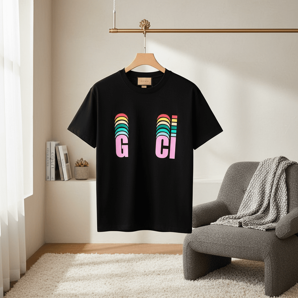 Gucci Black Cotton T-Shirt, soft and breathable, featuring pink letters with rainbow stripe logo design. Unisex casual fashion style, perfect for daily wear and expressing trendy individuality.