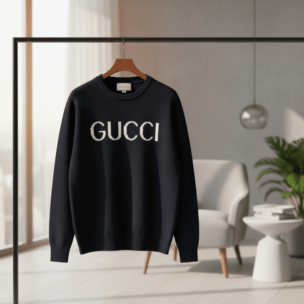 Gucci Deep Blue Knit Sweater – crafted from premium fabric, featuring iconic white Gucci lettering on the back. Unisex luxury style with superior comfort and elegance perfect for everyday wear.