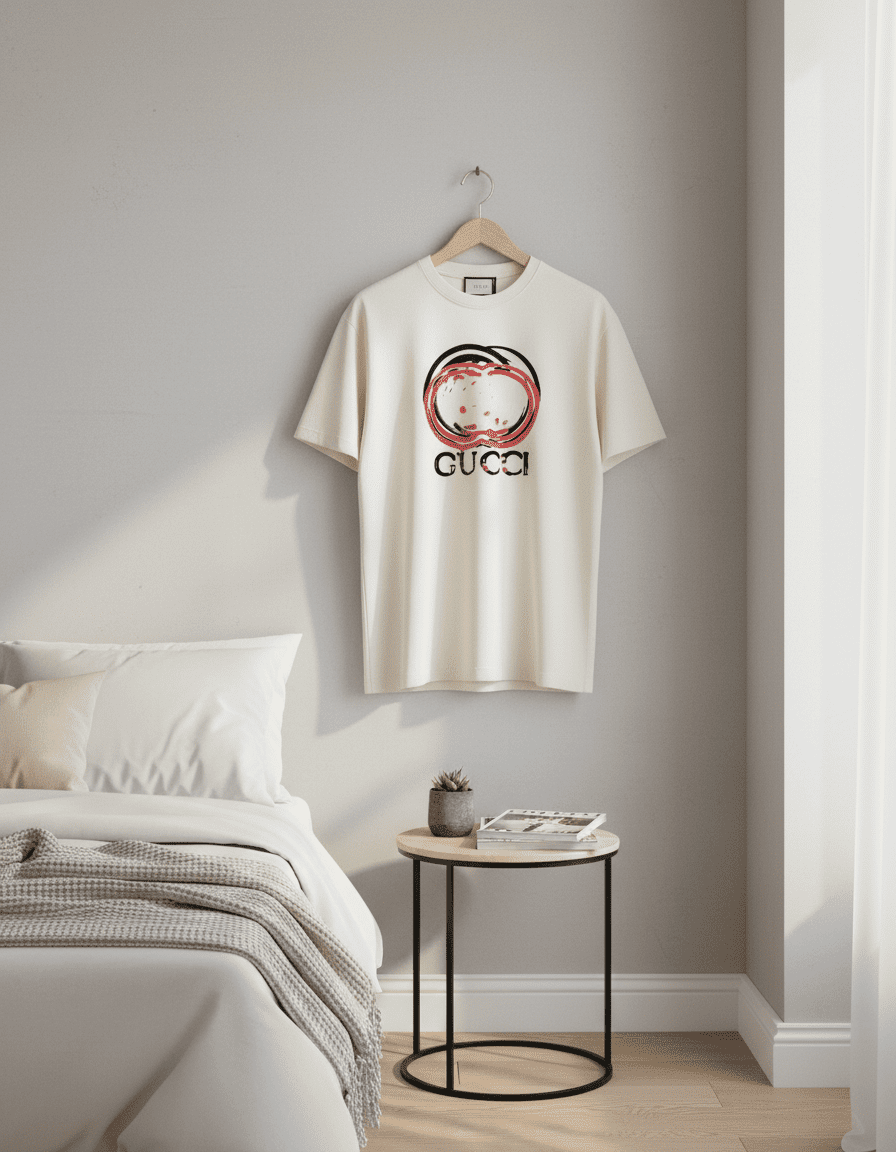 Gucci Off-White Cotton T-Shirt, soft breathable premium fabric, features red-black artistic double G logo, classic crew neck, unisex design for effortless luxury and everyday casual style.