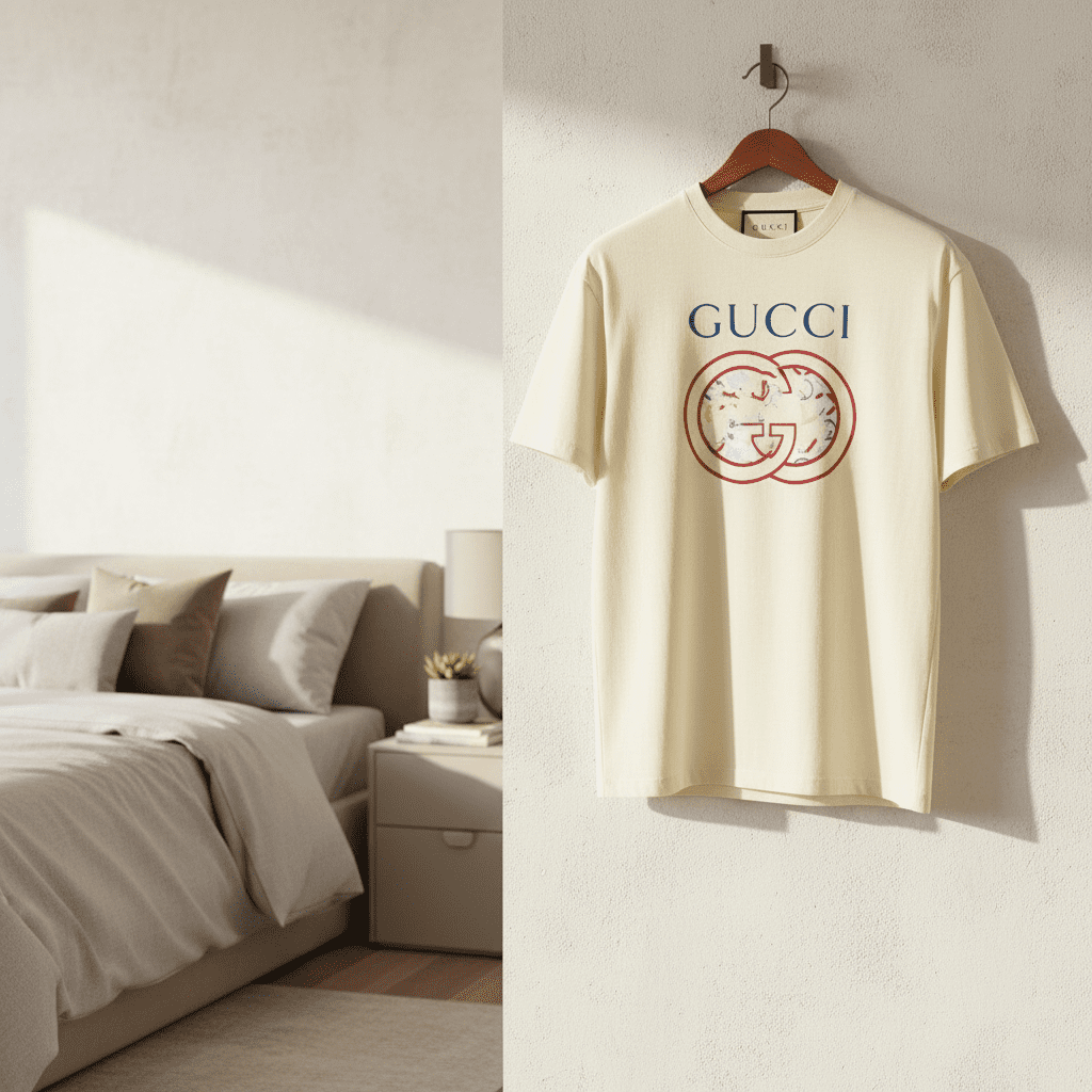 Gucci Off-White Cotton T-Shirt with Red Double G and Blue Logo, Unisex Casual Style, Soft Premium Fabric, Trendy and Comfortable, Showcasing Classic Gucci Elegance and Iconic Design.