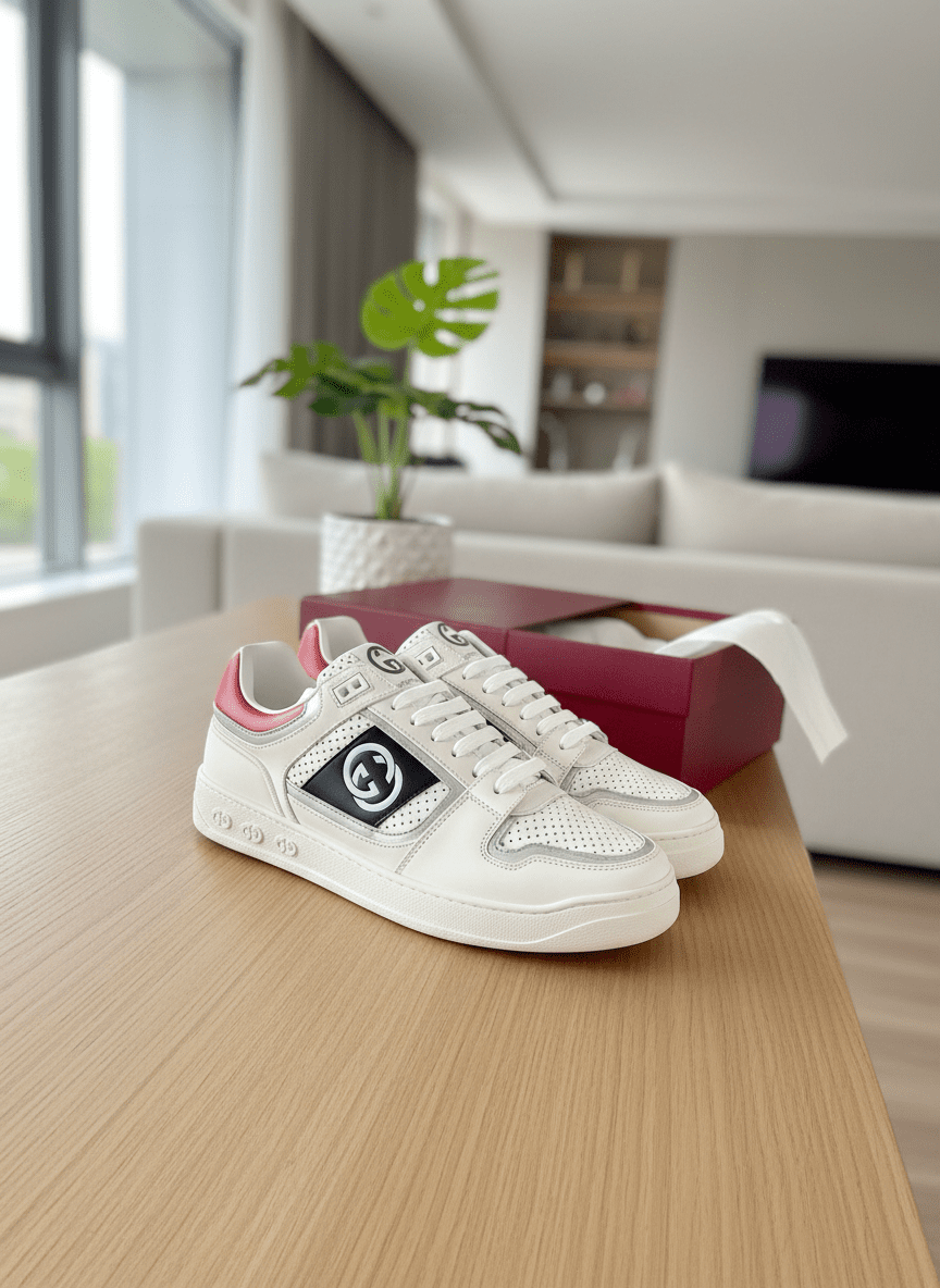 Gucci White Red Leather Sneakers feature premium leather, perforated design for breathability, iconic Double G logo, unisex style, perfect for daily casual wear with a touch of luxury.