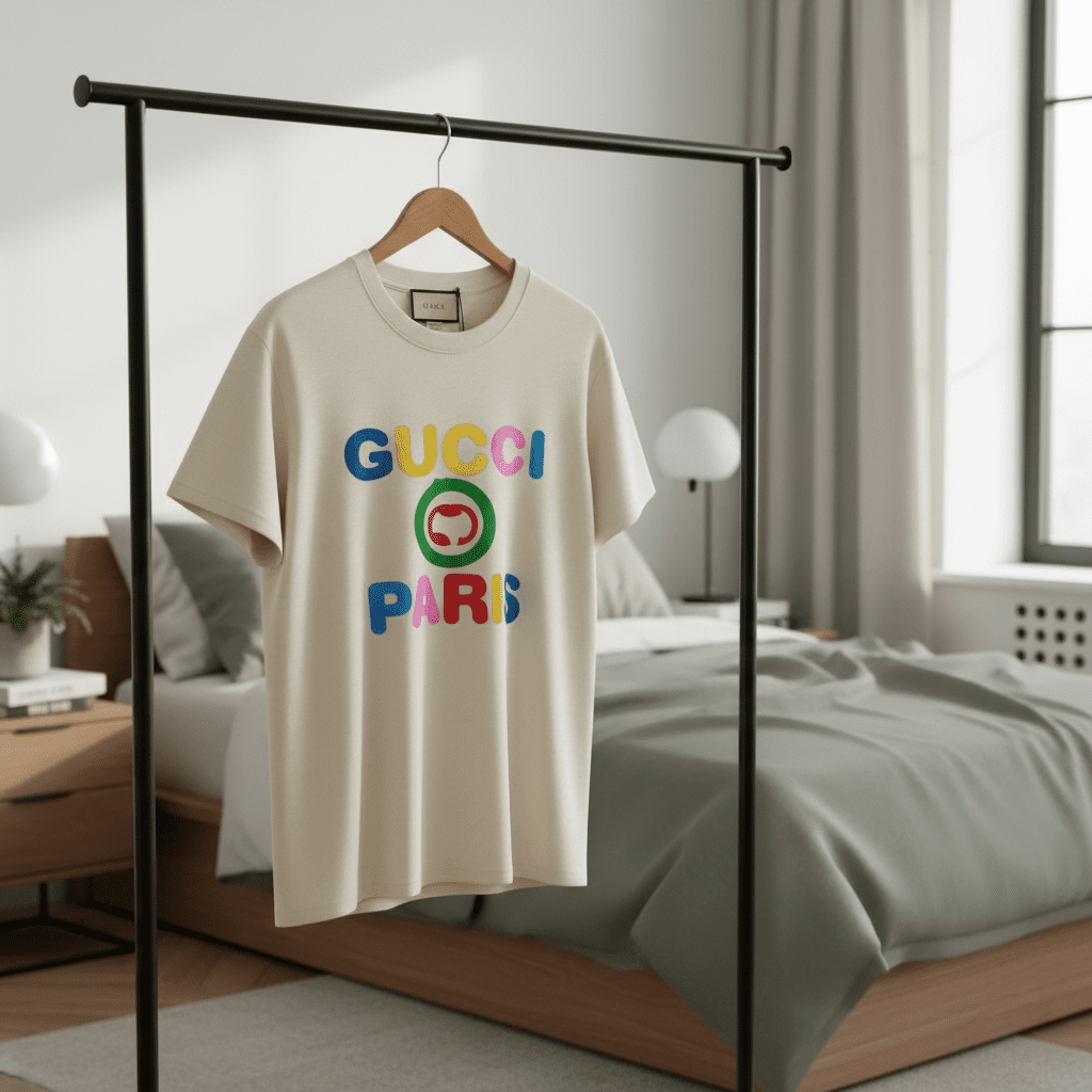 Gucci Beige Cotton T-Shirt featuring colorful “GUCCI PARIS” lettering with green circle and red pattern print, unisex stylish casual design, soft premium fabric for trendy everyday wear.