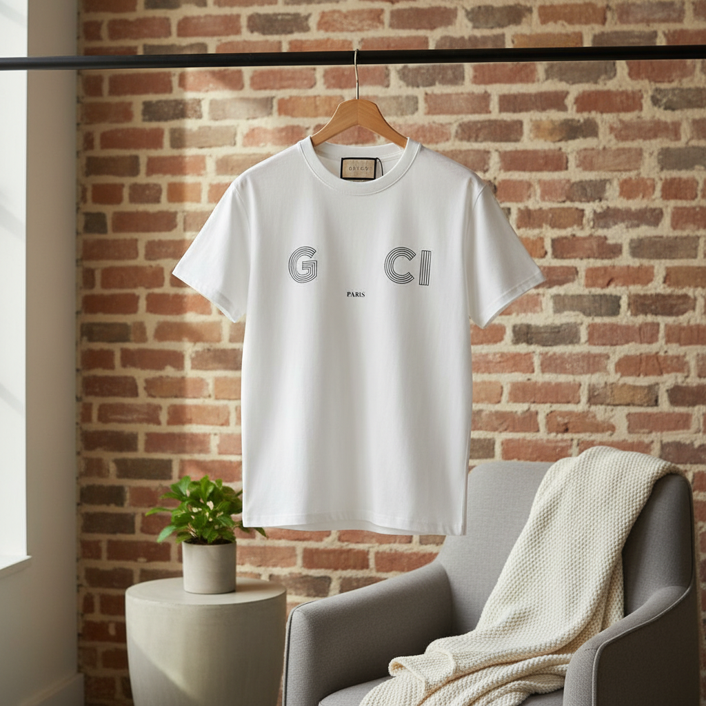 Gucci Paris Series White T-Shirt, made of premium cotton, features G, CI and PARIS line-letter design, minimalist unisex style, perfect for casual everyday wear and effortless fashion pairing.
