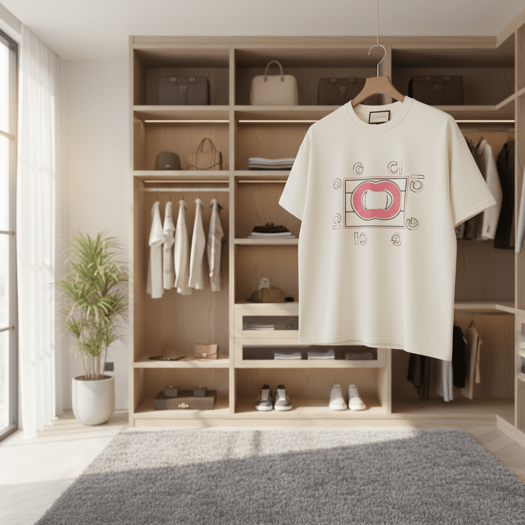 Gucci Iconic Totem Series Off-White T-Shirt, crafted from premium cotton for breathable comfort, featuring red Double G emblem with small G motifs, unisex design for trendy casual style.