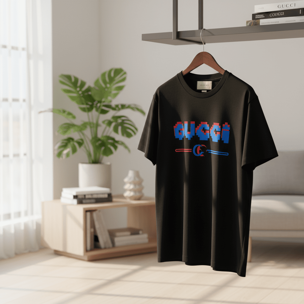 Gucci black unisex cotton T-shirt features soft breathable fabric, pixel-style “G” “Ci” letters with red-blue stripes and classic double G emblem for a modern, stylish everyday look.