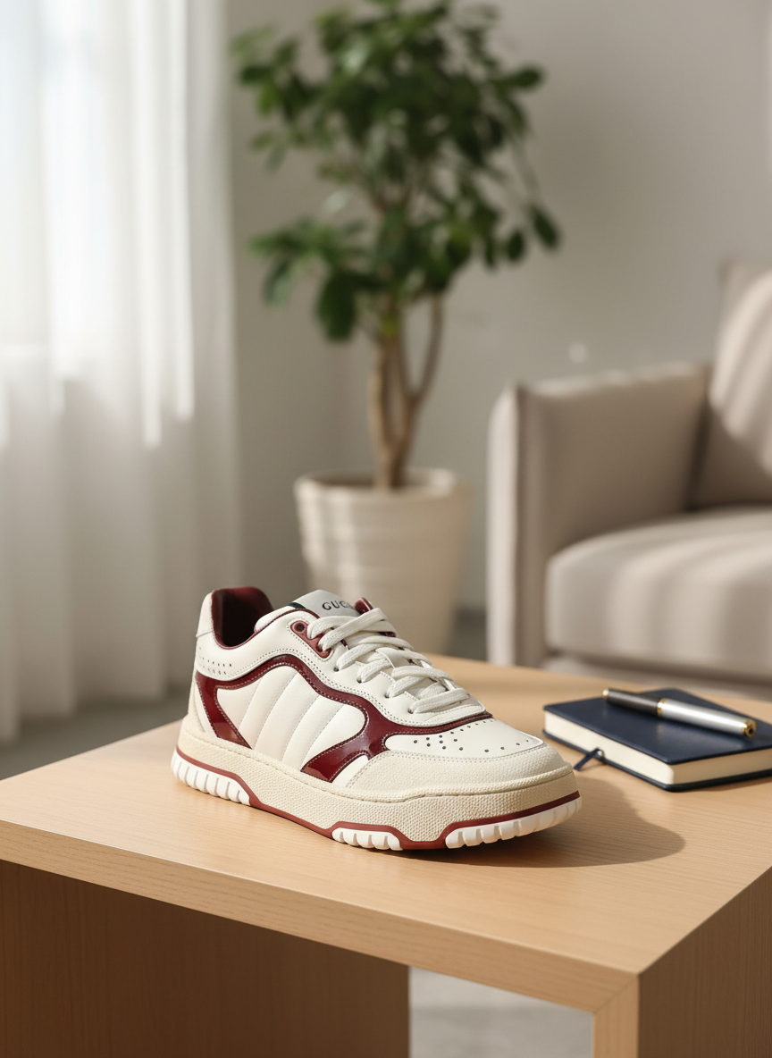 Gucci Retro Series Off-White & Burgundy Sneakers, premium leather and patent mix, striped thick sole, unisex comfort, classic vintage style for everyday fashion wear.