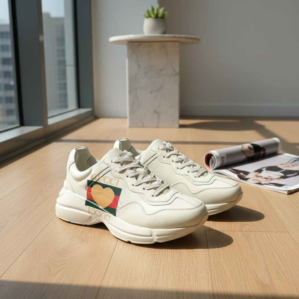 Gucci White Leather Sneakers featuring signature red-green stripe and logo detail, stylish retro unisex design with cushioned comfort, perfect for everyday luxury wear.