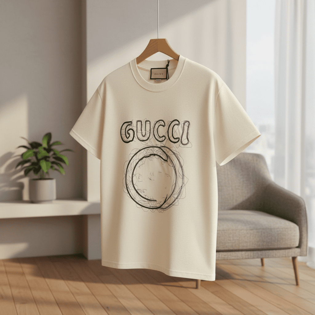 Home / T-Shirts/ Gucci Sketch Logo Beige Cotton T-Shirt