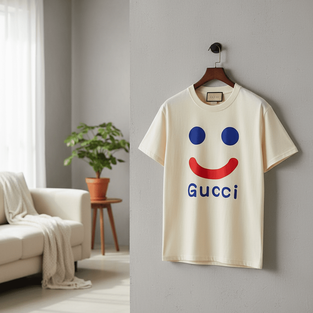 Gucci Cream Smiley Face Cotton T-Shirt, made from premium breathable fabric, features blue-red contrast design, unisex fit, blending luxury and casual style for a chic everyday fashion statement.