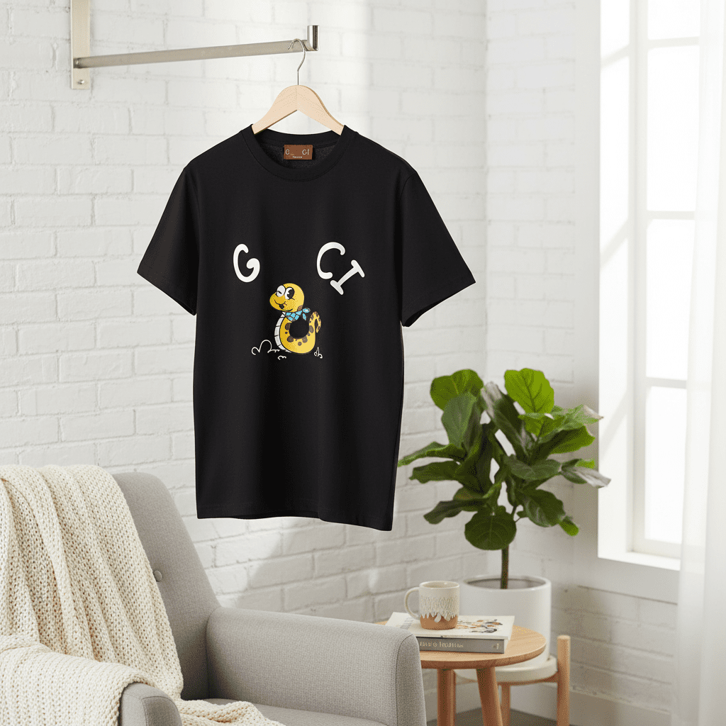 Gucci Cartoon Snake Black T-Shirt, made from premium cotton, features a round neck, breathable comfort, playful snake print with G CI logo, unisex design for casual trendy everyday wear.