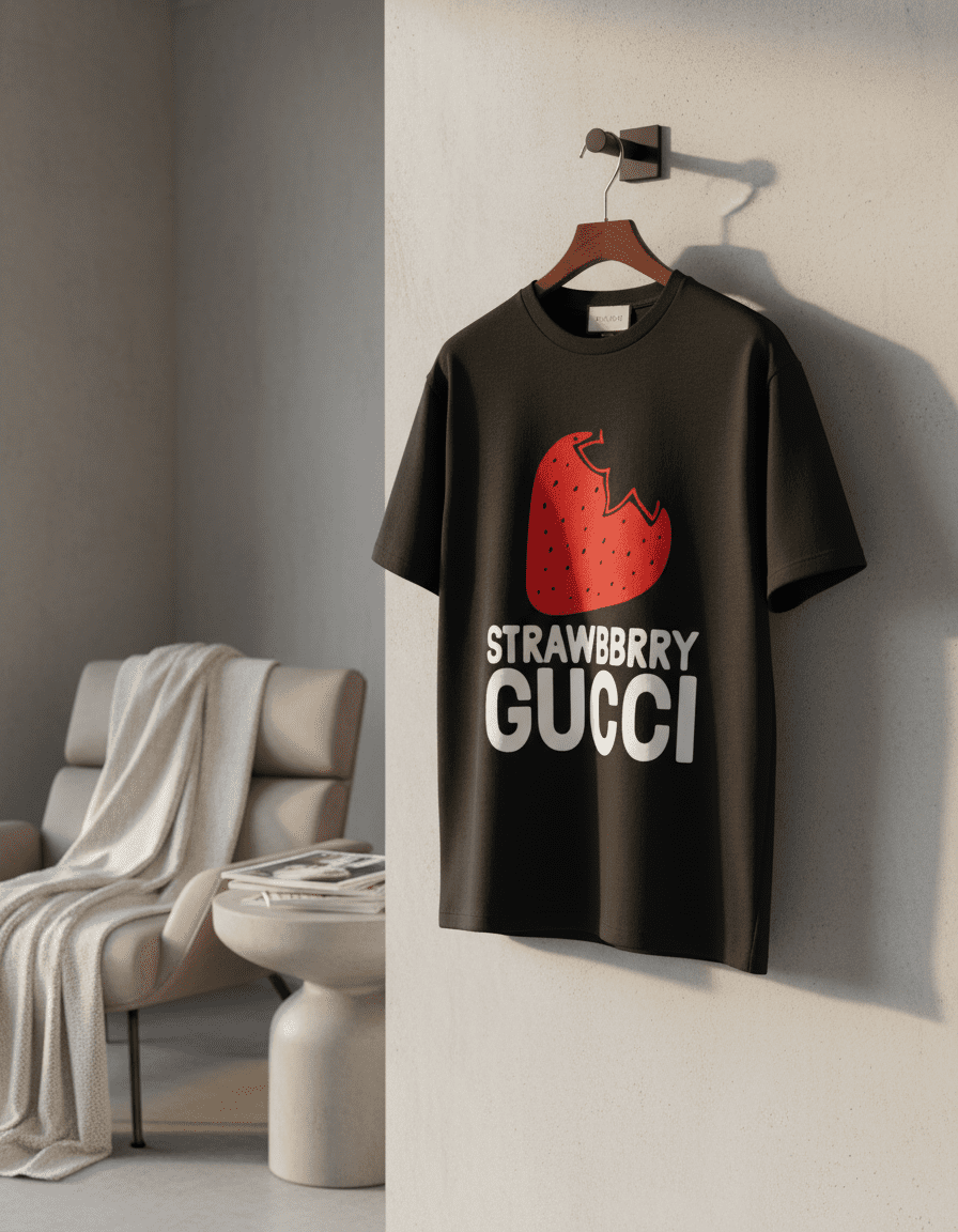 Gucci Strawberry Totem Black T-Shirt – premium cotton, breathable comfort, red strawberry print with white creative lettering, unisex design, perfect for daily casual fashion style.