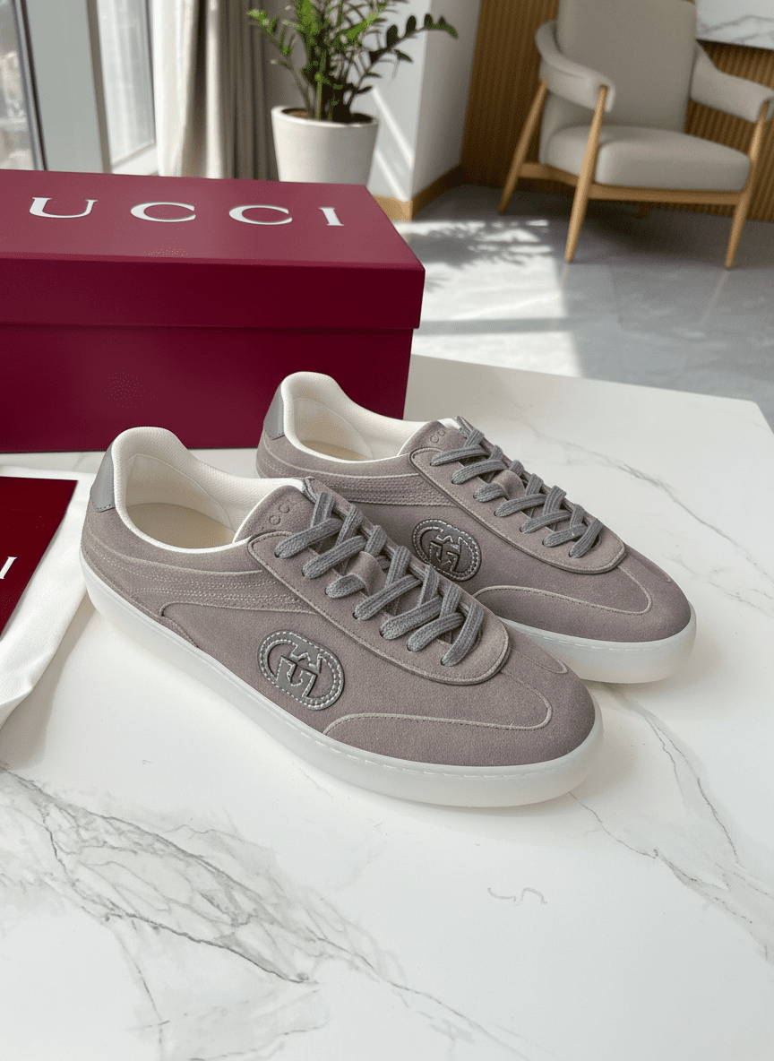 Gucci Classic Grey Suede Sneakers featuring signature logo details and transparent soles; stylish, breathable, unisex design perfect for daily casual wear and comfort.