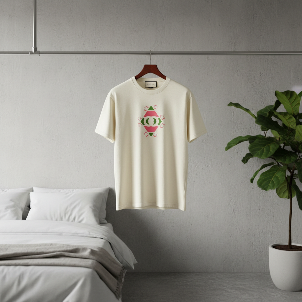 Gucci Trend Series Off-White T-Shirt, crafted from premium breathable cotton, features a diamond pattern with double G and pink-green contrast, unisex luxury casual wear with iconic style.