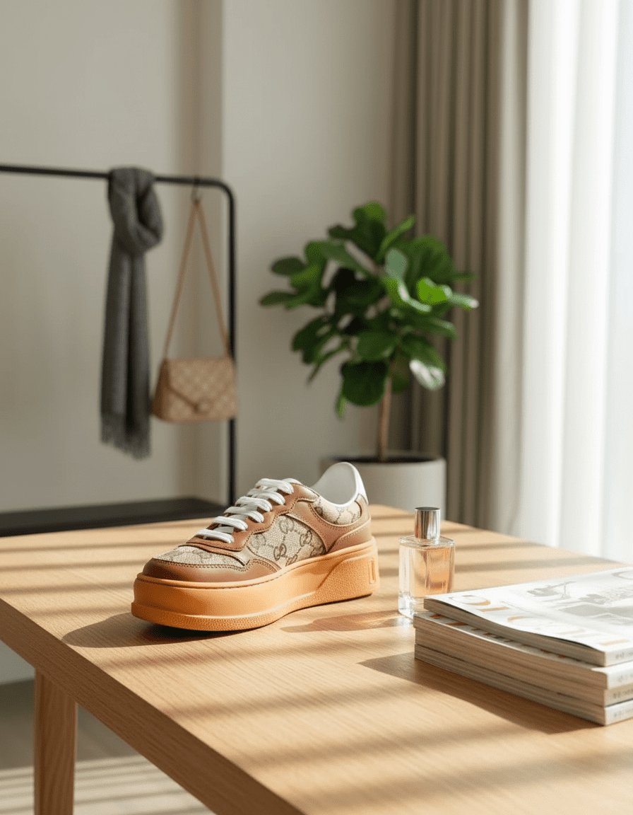 Gucci Classic Brown Beige Platform Sneakers, featuring iconic monogram canvas and leather mix, retro chic style, height-boosting sole, unisex design, perfect for daily casual wear with timeless elegance.