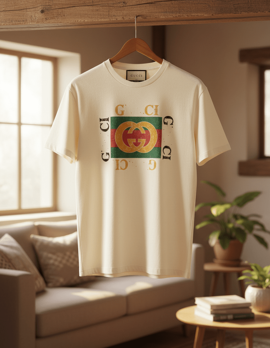 Gucci White Cotton T-Shirt featuring vintage Double G emblem with red-green stripe backdrop and surrounding Gucci lettering, unisex design, breathable comfort, perfect for daily stylish wear.