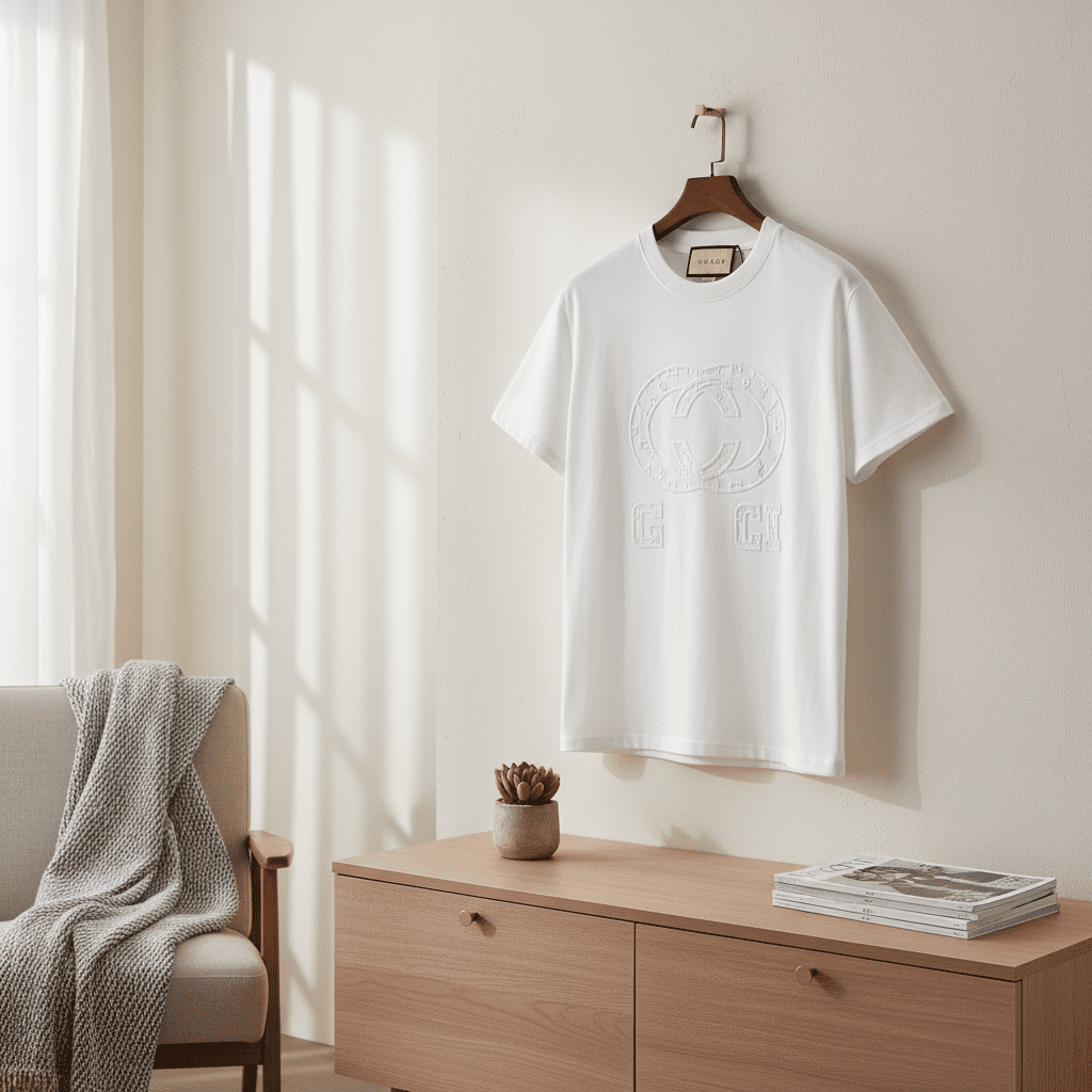Gucci White Cotton T-Shirt with embossed Double G and circular motif, breathable and stylish unisex design, classic luxury fashion perfect for casual wear.