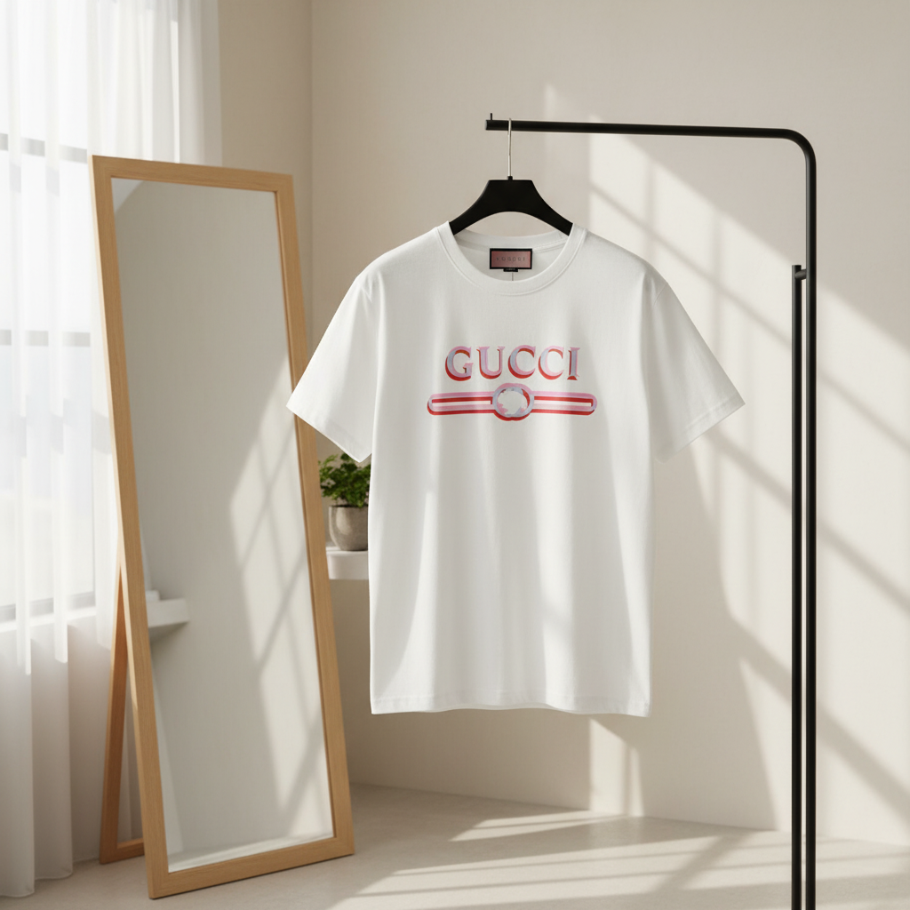 Gucci White Cotton T-Shirt featuring soft breathable fabric, signature logo and circular motif print, minimalist unisex design, perfect for everyday casual wear with a touch of luxury style.
