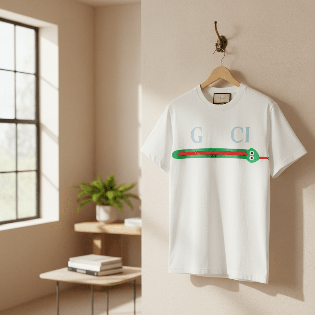 Gucci White Cotton T-Shirt features soft breathable fabric, green-red snake motif, and blue logo print, offering a stylish unisex luxury casual look perfect for everyday wear.