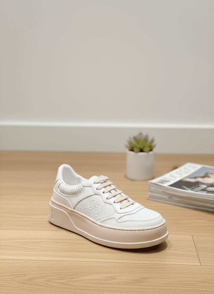 Gucci White Platform Sneakers crafted from leather and breathable mesh, featuring iconic Double G logo, retro style, unisex design, perfect for daily wear with luxurious comfort and timeless fashion.