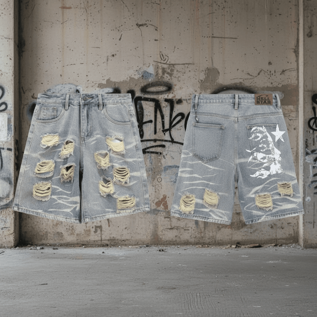 Discover trendy washed distressed shorts in grey. Featuring irregular holes & white star & wave graffiti on back. Perfect for streetwear fashion lovers.