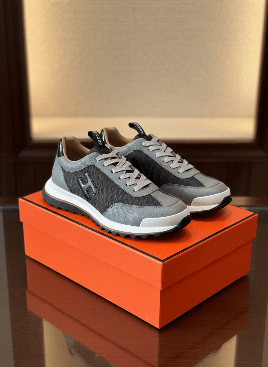 Hermes Hugo Sneakers Imported Leather Breathable Mesh Charcoal Gray