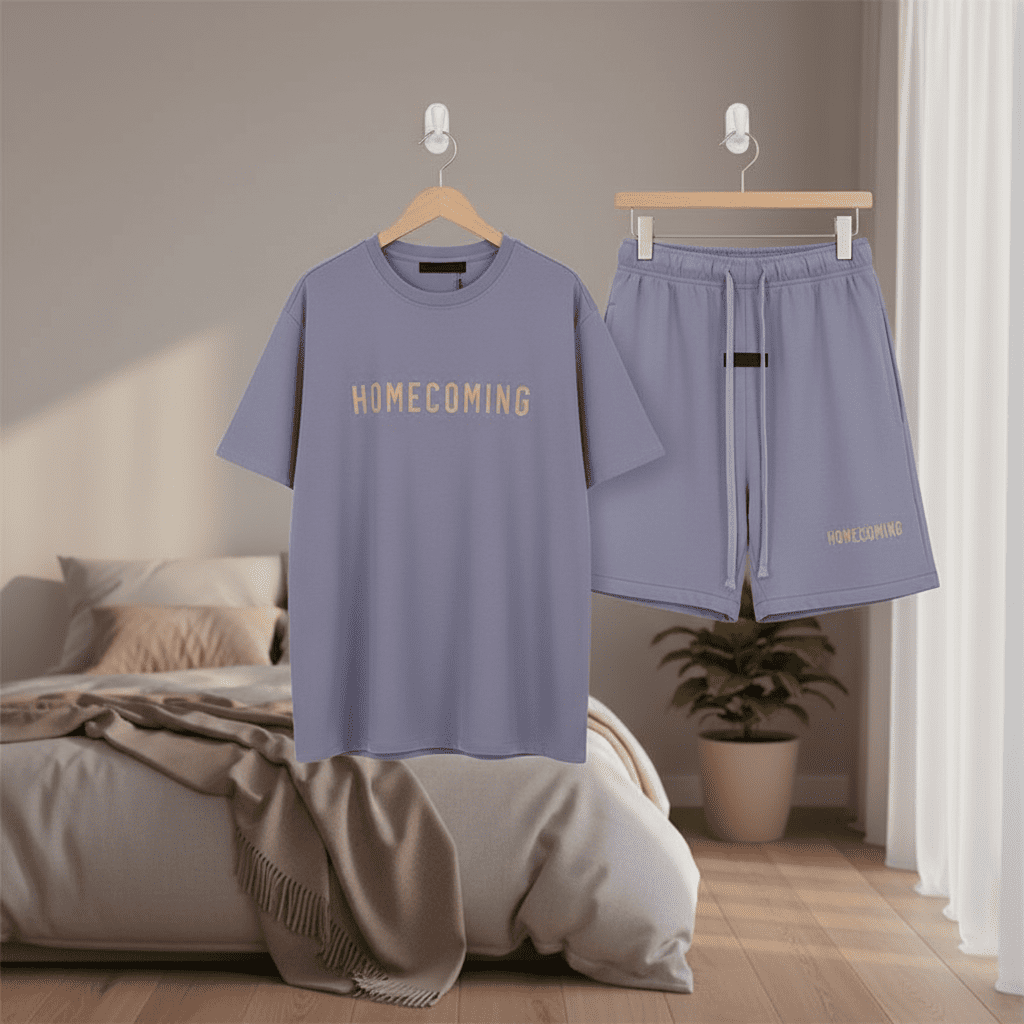 Essentials Lilac Cotton Set, soft and breathable fabric with gold HOMECOMING logo on T-shirt and shorts, loose unisex fit, perfect for daily wear with casual minimalist style.