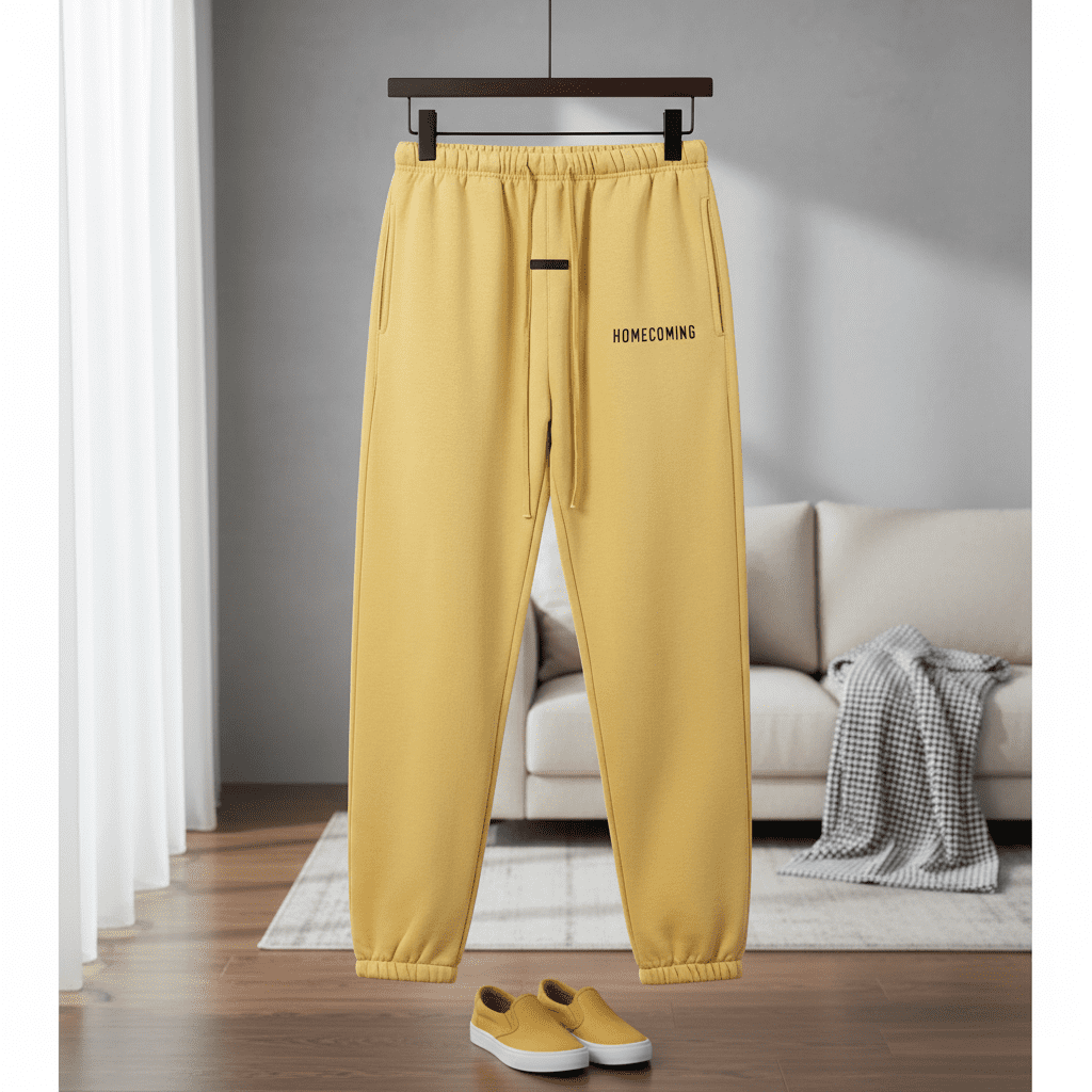 PantsEssentials Essentials Light Khaki Jogger Pants made of premium cotton, breathable and soft. Features side pockets, black “HOMECOMING” print, drawstring waist, unisex design, perfect for streetwear and daily style.