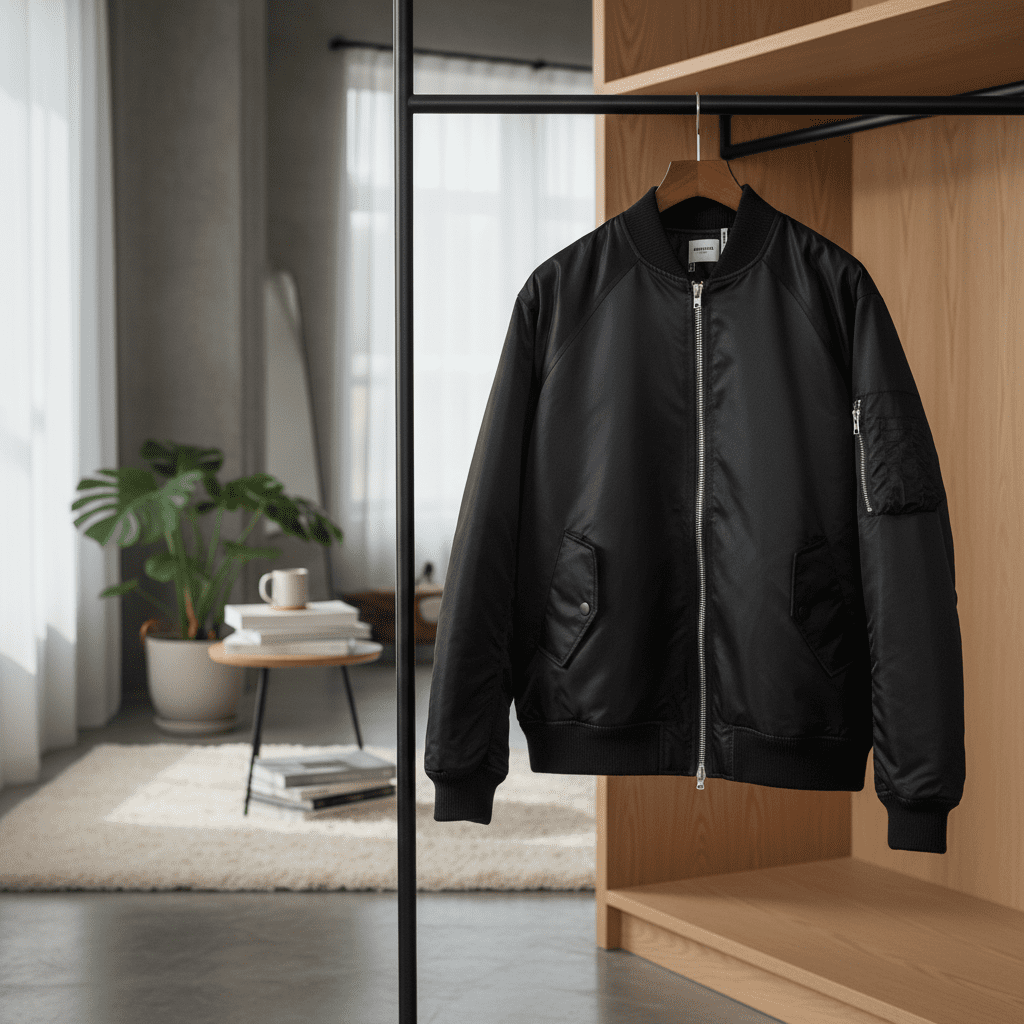 Essentials Black Bomber Jacket features smooth satin fabric, classic zip closure, ribbed collar and cuffs for warmth, handy side pockets, unisex street style, perfect for daily casual or commute wear.