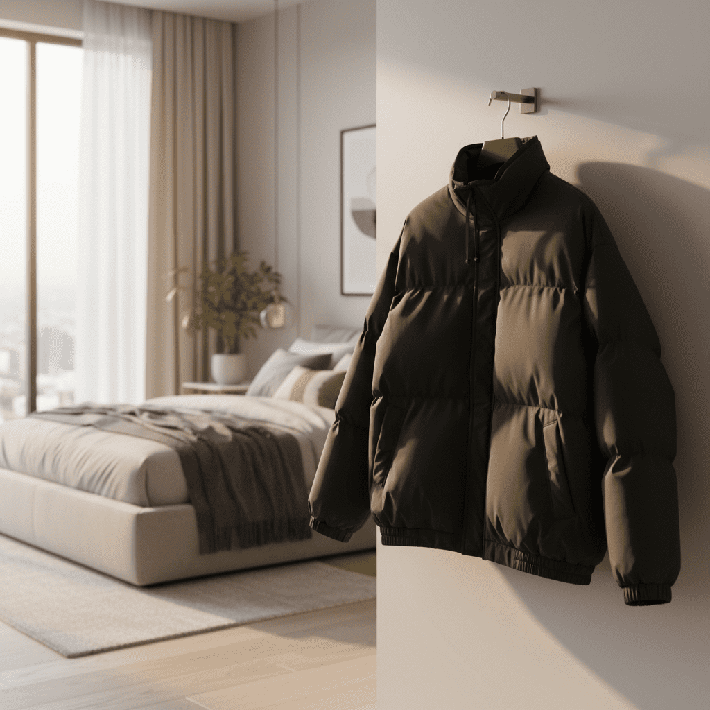 Essentials Black Stand Collar Warm Jacket, made with windproof fabric, zip closure, drawstring waist and cuffs, unisex casual style for daily commute or outdoor wear, cozy, durable, and stylish.