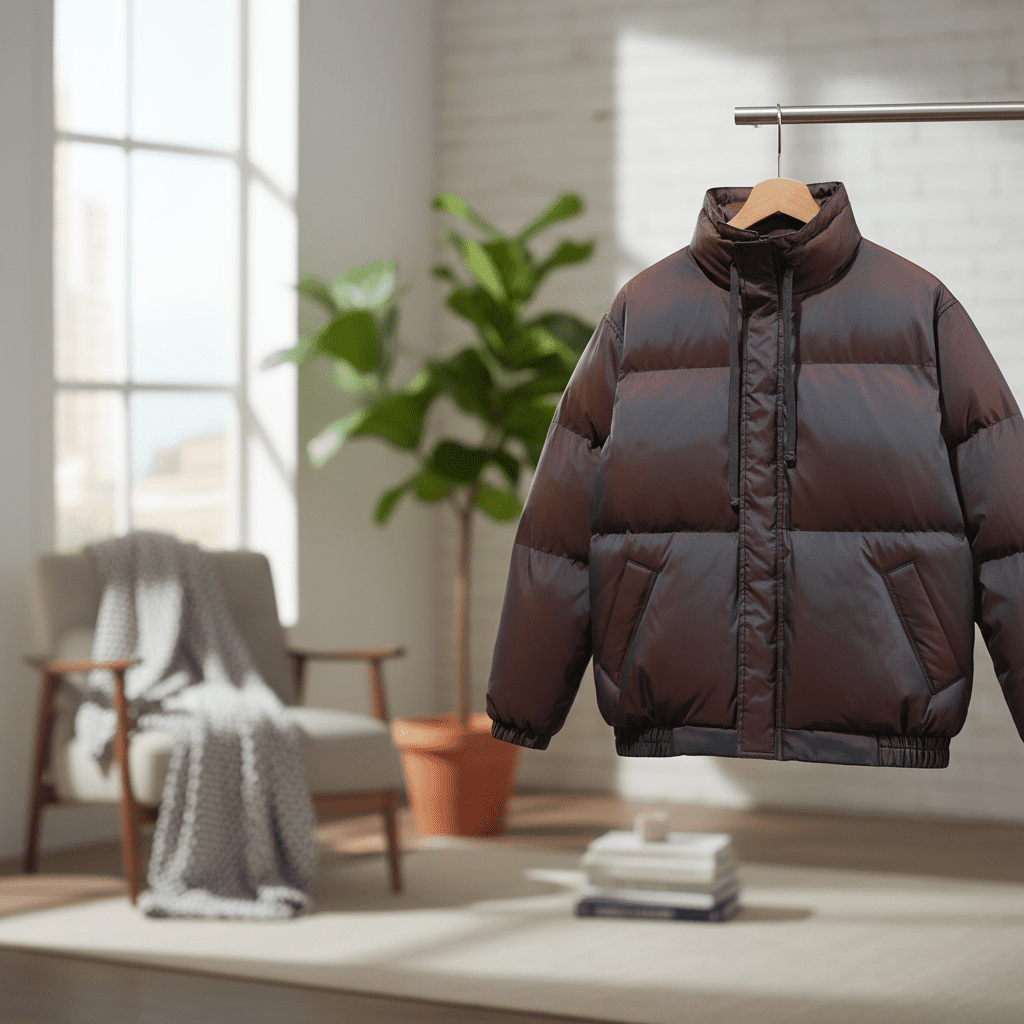 Essentials Burgundy Stand Collar Quilted Jacket, windproof fabric, adjustable drawstring waist, unisex design, warm and cozy, minimalist street style, perfect for everyday wear.