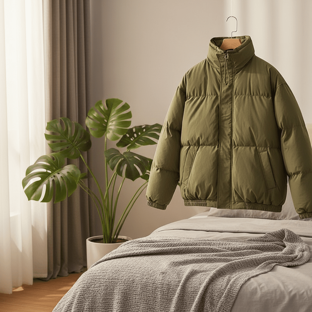 Essentials Classic Olive Green Puffer Jacket features lightweight windproof fabric, adjustable stand collar, unisex loose fit, minimalist street style for everyday wear, warm, cozy, and fashion-forward.