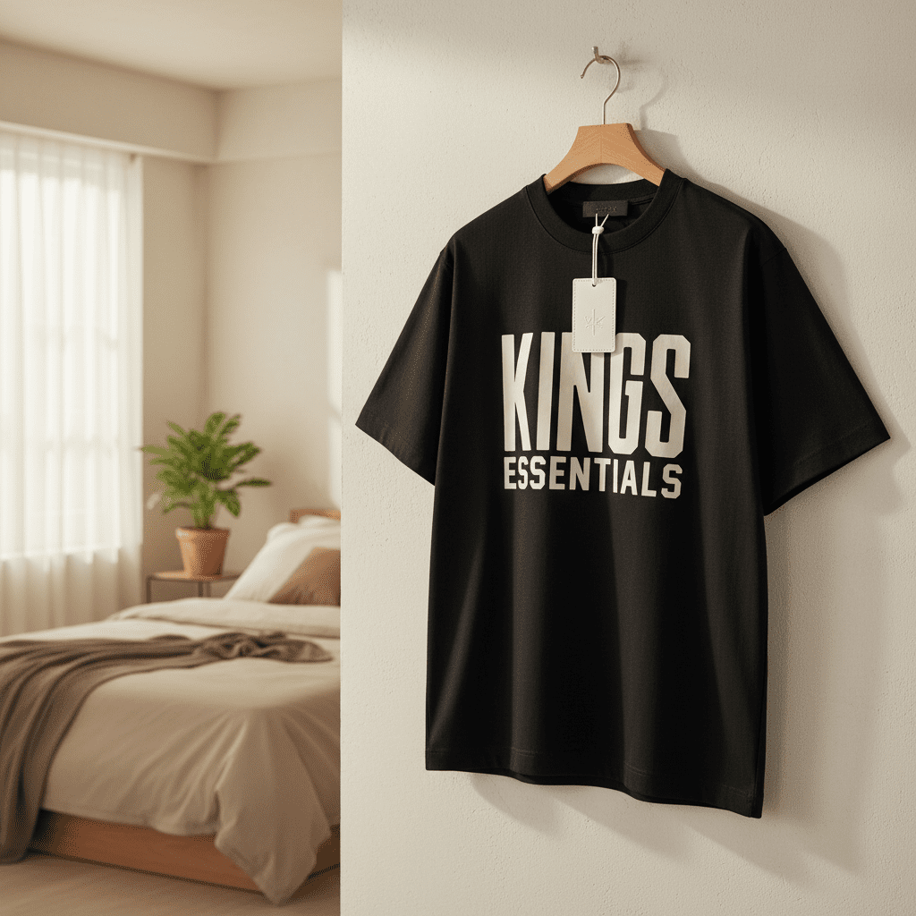 Essentials KINGS Series Black Oversized T-Shirt made from soft breathable cotton, featuring bold white “KINGS ESSENTIALS” print, unisex streetwear style, perfect for daily casual fashion.