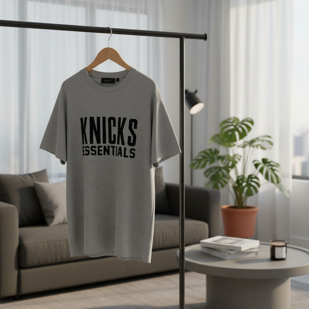 Essentials Grey T-Shirt features premium cotton for softness and breathability, unisex loose fit, black “KNICKS ESSENTIALS” print, minimalist streetwear style for everyday comfort and fashion.