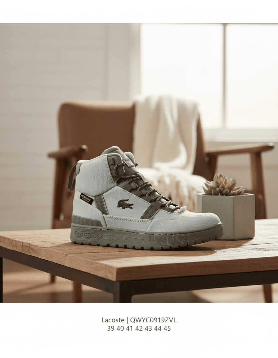 Lacoste QWYCO919ZVL high-top casual sneakers feature light gray and olive green patchwork canvas, classic crocodile logo, COROBA tag, unisex design, durable and comfortable for everyday street style.