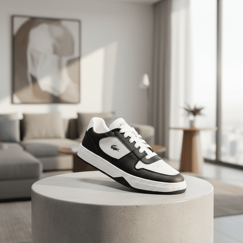 Lacoste Crocodile Black White Casual Sneakers crafted from premium leather, featuring the iconic crocodile logo, unisex design, breathable comfort, and timeless style for everyday wear.