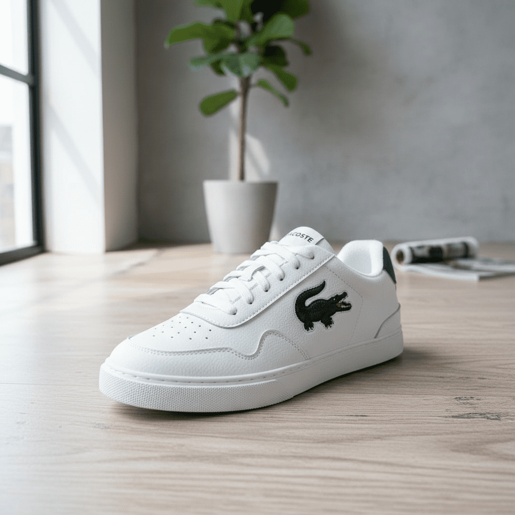 Lacoste White Leather Casual Sneakers feature a breathable perforated toe, iconic black crocodile logo, green heel detail, unisex design, stylish minimalist look, perfect for daily comfort and fashion.