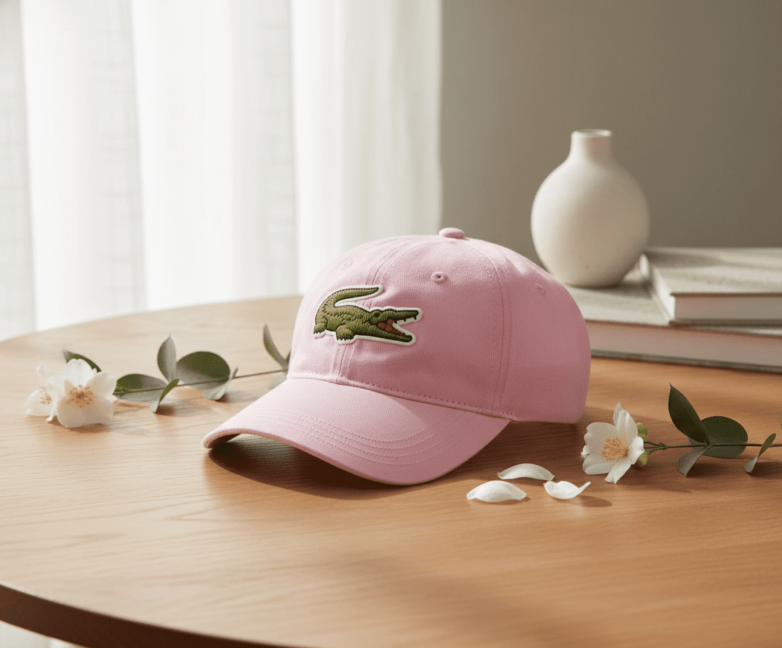 Lacoste Pink Classic Baseball Cap, made of breathable cotton, features signature green crocodile embroidery, six-panel design with adjustable strap, unisex casual style for everyday wear.