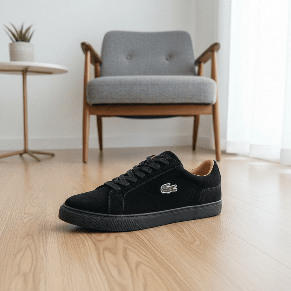 Lacoste Black Suede Casual Shoes – crafted from premium suede, featuring the iconic crocodile embroidery, minimalist unisex design, stylish and versatile for everyday comfort and timeless fashion.