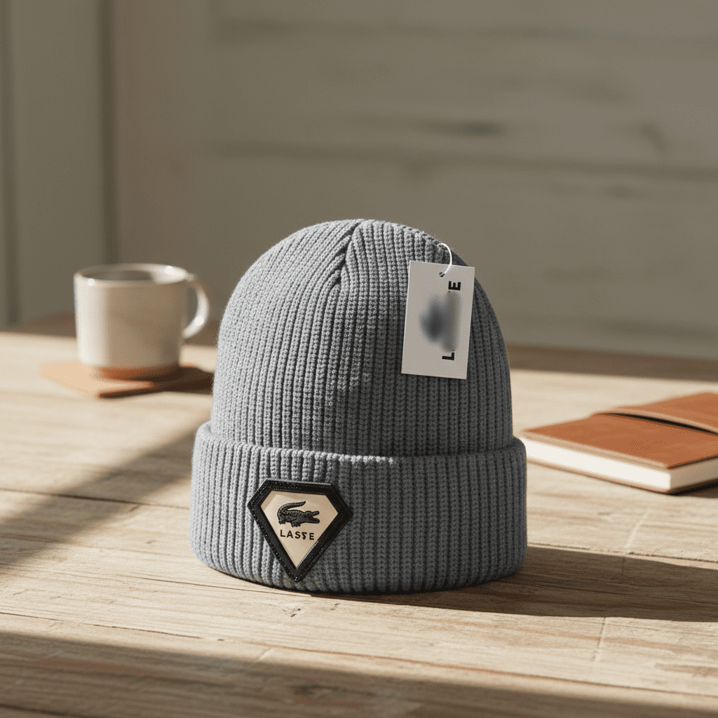 Lacoste Gray Knit Beanie, made of soft ribbed fabric for warmth and comfort, features a diamond patch with iconic green crocodile logo, classic rolled edge, unisex casual style for daily and outdoor wear.