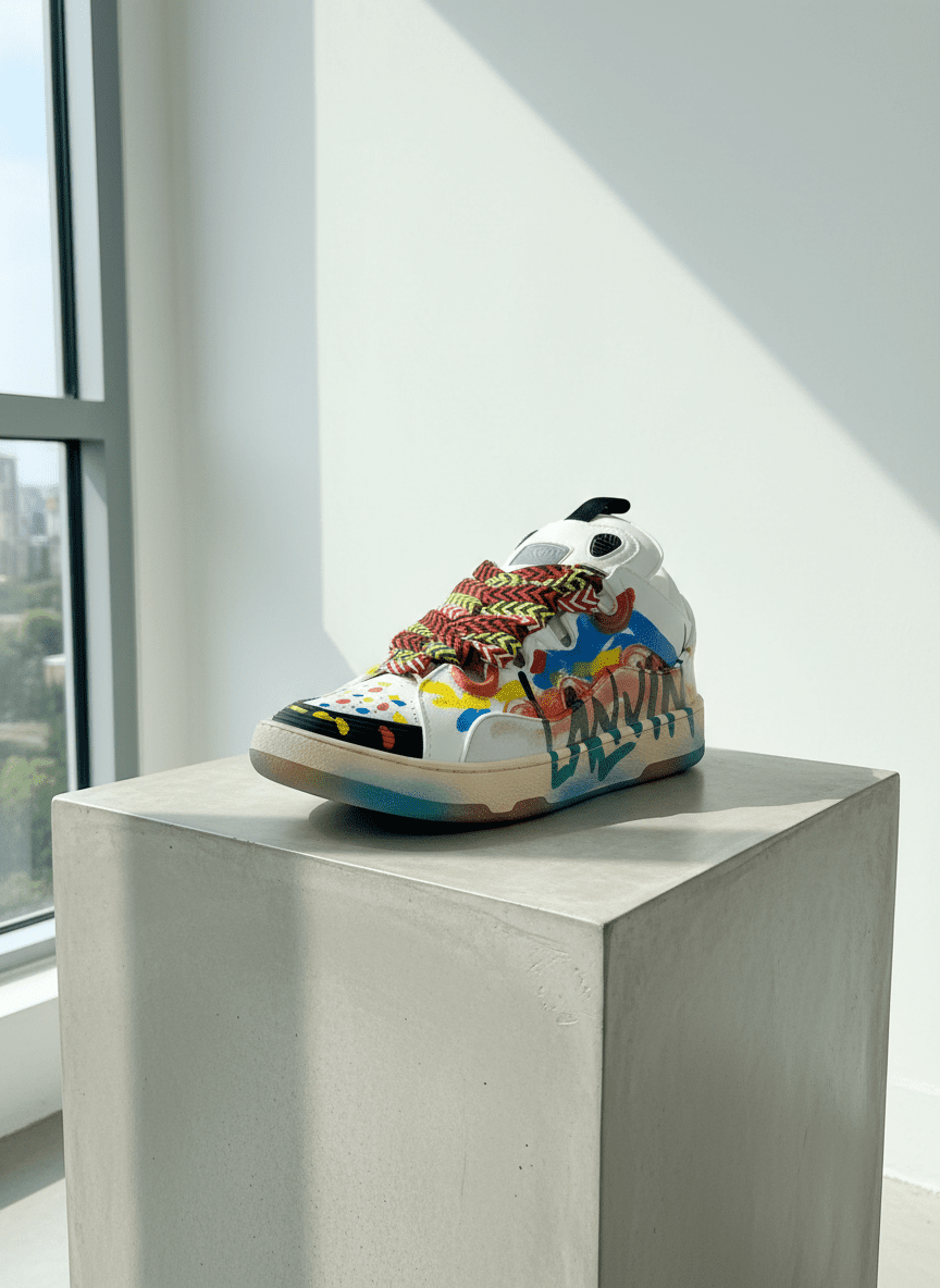Lanvin Colorful Graffiti Low-Top Sneakers feature premium leather, hand-painted artistic designs, woven laces, trendy unisex style, and all-day comfort for a bold, versatile look.