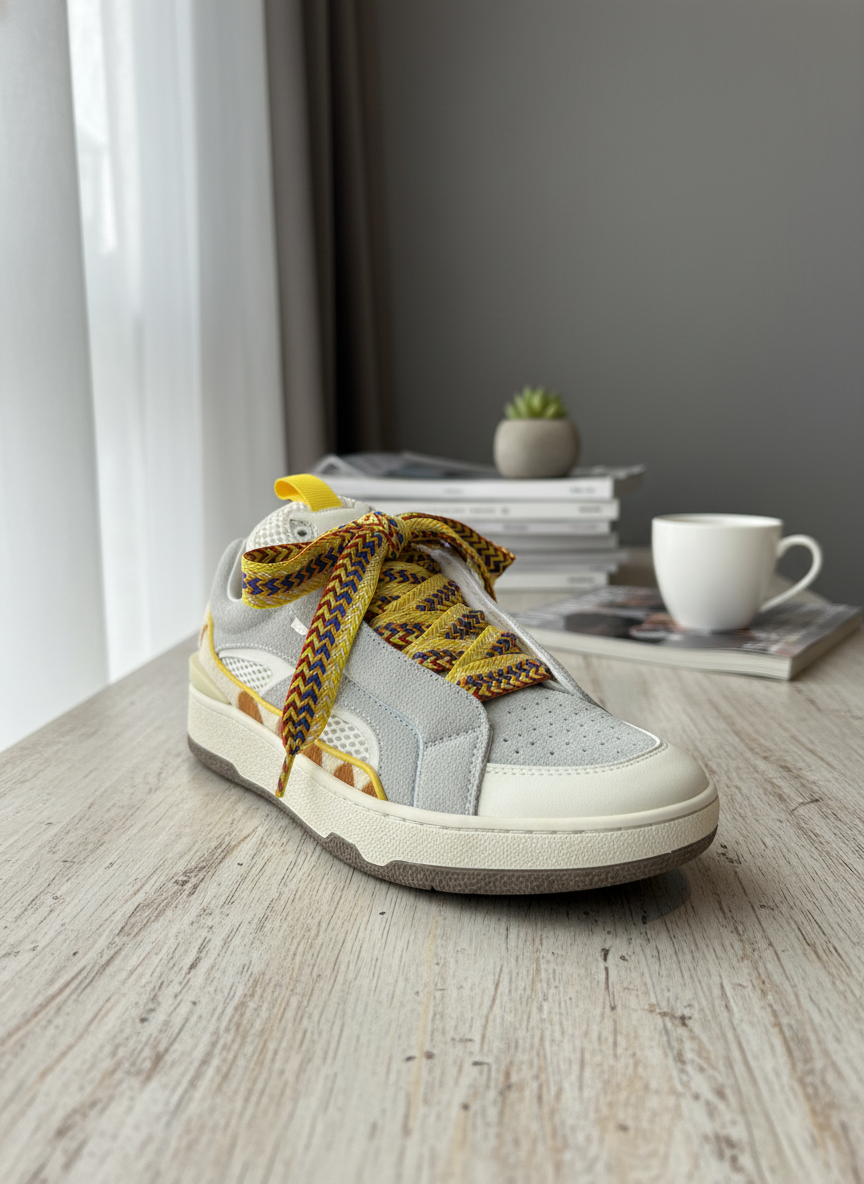 Lanvin Light Gray Unisex Casual Sneakers feature suede and breathable mesh with colorful woven laces, offering comfort, style, and a trendy look perfect for daily wear.