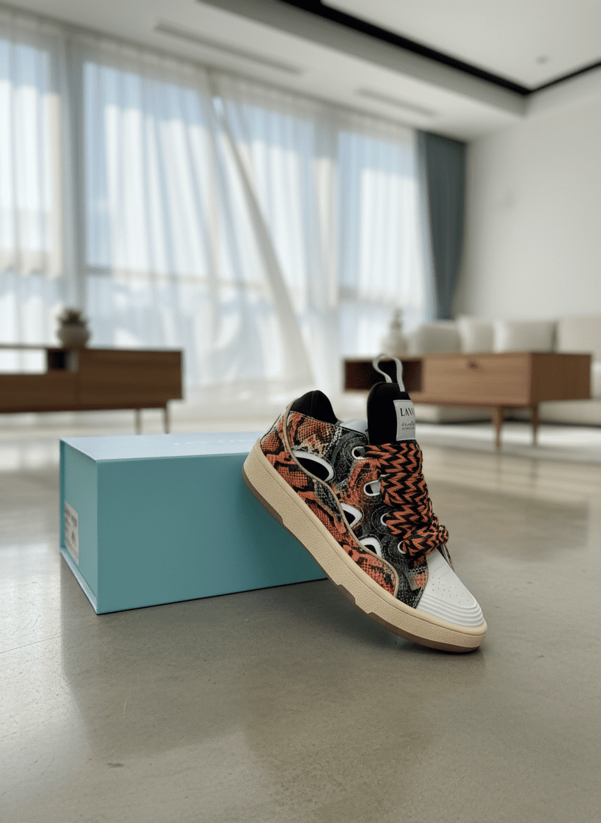 Lanvin Pink Diamond Snake Print Sneakers feature vibrant woven laces, a thick cushioned sole, and unisex trendy style, showcasing bold personality and high-end fashion appeal.