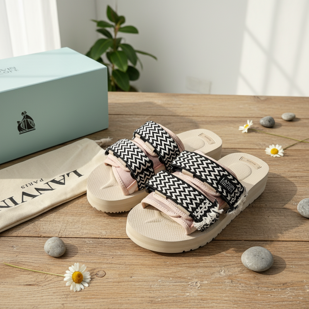 Lanvin x Suicoke Pink Sandals feature black-white zigzag dual straps, woven fabric, anti-slip sole, unisex comfort, and effortless modern street style.